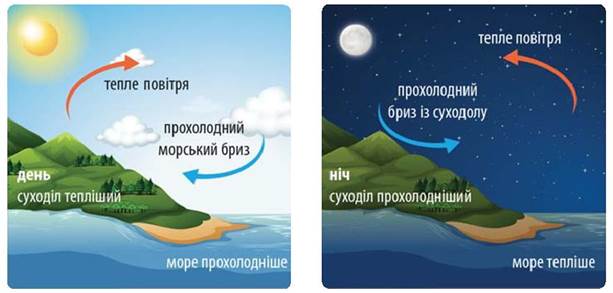 2. Визнач, за яких умов формуються постійні, змінні і місцеві вітри.