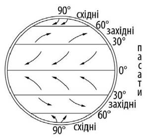 Утворення постійних вітрів зумовлене різними зонами атмосферного тиску. В екваторіальних широтах (зоні низького тиску) тепле повітря піднімається вгору, переноситься до тропіків, опускається біля 30° обох півкуль і повертається до екватора пасатами. У помірних широтах дмуть постійні західні вітри, а у полярних — східні. Завдяки дії сили Коріоліса постійні вітри відхиляються вправо за напрямком у Північній півкулі і вліво — у Південній (мал. 132).