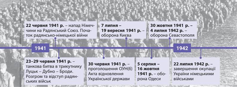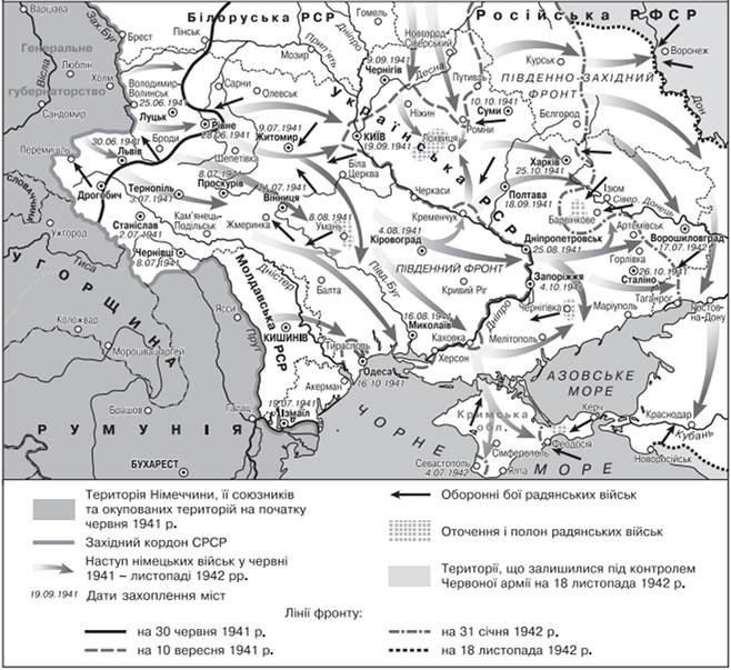 Бойові дії на території України у 1941 р. перетворилися для радянських військ на катастрофу. Війська Червоної армії не були готові до належної відсічі агресорові, тому Вермахт досить швидко окупував великі території СРСР. До середини липня, тобто за три тижні боїв, Червона армія втратила 850 тис. бійців і командирів, близько 3,5 тис. літаків і понад 6 тис. танків. Зі 170 дивізій діючої армії на радянсько-німецькому фронті боєздатність зберігали тільки 70. Німецькі бойові втрати в живій силі були майже в 10 разів меншими. До німецького полону потрапили мільйони червоноармійців. Проте в оборонних боях 1941 р. було зірвано гітлерівські розрахунки на «блискавичну війну» (бліцкриг).