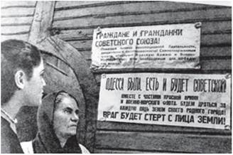Одесити розглядають листівку: «Одеса була, є і буде радянською». Серпень 1941 р.