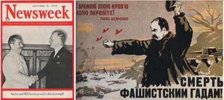 Проаналізуйте ілюстрації. З чим пов’язані зміни в політиці СРСР, засвідчені обкладинкою американського щотижневого журналу новин Newsweek за 1939 р. із зображенням Сталіна та Ріббентропа та радянського плаката початкового періоду німецько-радянської війни?