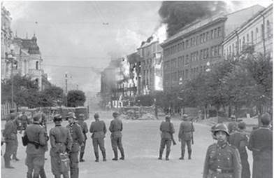 Німецькі солдати спостерігають за пожежею на Хрещатику. Вересень 1941 р.