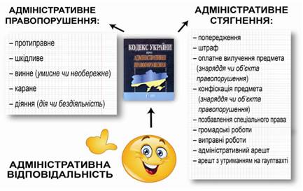Одним із видів правопорушень, як ви вже знаєте, є проступки, які можуть мати різний ступінь шкідливості й посягати на різні цінності і блага, що охороняються державою. Ті з них, що посягають на державний чи суспільний порядок, на власність, права і свободи громадян, права і законні інтереси підприємств, установ і організацій, на встановлений порядок управління тощо, називають адміністративними. А відповідальність за їх учинення передбачена Кодексом України про адміністративні правопорушення (далі — КУпАП), прийнятим ще 07.12.1984 р., та іншими законами (це визначає Стаття 2 КУпАП).