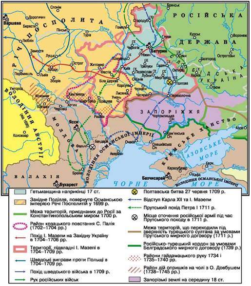 1702-1704 рр. - повстання на Правобережній Україні на чолі із Семеном Палієм. 1708 р. - похід шведського короля Карла ХІІ на Москву через Україну.
