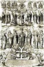 • У центрі І. Мазепа, збоку від нього - жіночі постаті, що символізують істину, правду, науку, мистецтво тощо. На тлі військових обладунків - герб Мазепи. Зображено також церкви, збудовані або відновлені І. Мазепою.