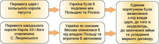 • Використовуючи схему, поміркуйте, як зовнішньополітичні умови, що склалися внаслідок Північної війни, підштовхнули І. Мазепу до переходу на бік шведського короля.