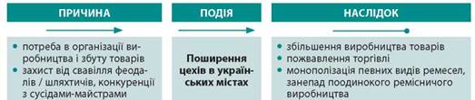 • У XIV - на початку XVI ст. активно розвивалися українські міста. Вони перетворювалися на центри внутрішньої і зовнішньої торгівлі Литви й Польщі. З пожвавленням торгівлі в українських містах, особливо на Галичині, з’явилося чимало іноземців, які принесли свою культуру і суспільний лад на українські терени. В Україні поширилося магдебурзьке право, яке міста купували у великого князя литовського чи польського короля. У містах із магдебурзьким правом поширилася цехова система, що сприяло збільшенню ремісничого виробництва та удосконаленню товарів.