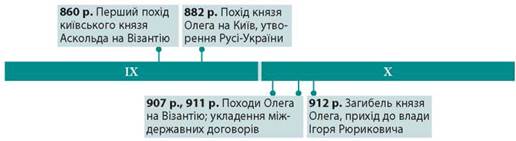 Від 882 р. княжити в Києві почав Олег із роду Рюрика. Саме з його правлінням пов’язують утвердження в Русі-Україні династії Рюриковичів. За свідченням літописця, Олег княжив у Києві 30 років, виявивши хист мудрого володаря й талановитого полководця. Олегові як новгородському князю підкорялися племінні союзи словен і кривичів, а також неслов’янські народи, зокрема меря, весь та чудь. Здобувши Київ силою, Олег наразився на спротив сусідніх княжінь. Літописець розповідає, що князеві довелося воювати проти деревлян і сіверян, які не бажали визнавати його владу. 885 р. Олег приєднав землі радимичів. Згодом пішов у похід проти уличів і тиверців, з якими домовився про спільні воєнні походи. Із варязькими воєводами Олег уклав мирний договір, за яким упродовж тривалого часу київські князі залучали до себе на службу варязькі дружини.