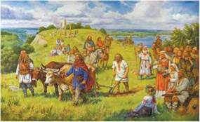 1. Роздивіться картину-реконструкцію заснування Києва. Хто із зображених на малюнку персонажів є, на вашу думку, засновниками Києва? 2. Які верстви слов’янського суспільства зображені? Використовуючи раніше набуті знання про побут, заняття й вірування слов’ян, поміркуйте, чи відображає картина їхнє життя?