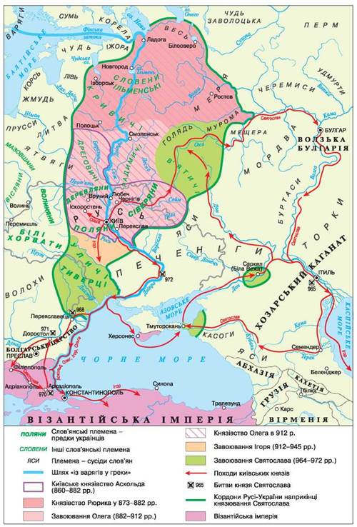 Проаналізуйте карту. 1. На які території поширювалася влада князя Аскольда? 2. За рахунок земель яких східнослов’янських союзів та неслов’янських народів зростала територія Київської держави за часів Олега?
