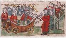 Олег та його воїни в човнах, поставлених на колеса. Візантійці платять данину Русі. Середньовічна мініатюра