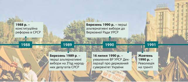 1. Установіть хронологічну послідовність подій: • Революція на граніті • конституційна реформа • перші альтернативні вибори до Верховної Ради УРСР • ухвалення Верховною Радою УРСР Декларації про державний суверенітет України.