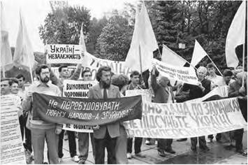 Проаналізуйте візуальне джерело. • 1. Які гасла на транспарантах свідчать про обстоювання пікетувальниками ідеї незалежності України? • 2. Унаслідок яких обставин суспільно-політичного життя в УРСР стало можливим швидке поширення цієї ідеї?