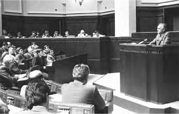 Зал засідань Верховної Ради УРСР під час ухвалення Декларації про державний суверенітет України. Виступає голова Ради Міністрів УРСР В. Масол. Київ, 16 липня 1990 р.