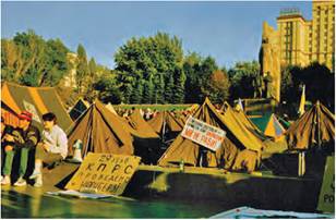 Наметове містечко на площі Жовтневої революції в Києві під час Революції на граніті. Жовтень 1990 р.