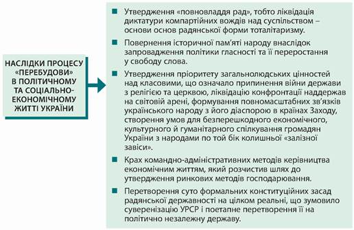 «З часом трансформувалася суть перебудови. Загальні вибори на альтернативній основі; гарантування свободи друку; розвиток багатопартійності; розширення прав трудових колективів; розмежування функцій партійних і державних органів; утвердження в суспільстві спочатку ідейного, а невдовзі й політичного плюралізму; законодавче оформлення економічної свободи; розширення прав союзних та автономних республік наближали крах тоталітарної системи...» (український історик Олег Бойко).