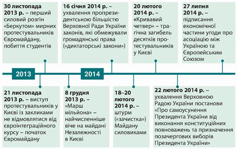 • «Кривавий четвер» - загибель пів сотні протестувальників - учасників Революції Гідності • позачергові президентські вибори, обрання П. Порошенка Президентом України • перше застосування сили для розгону мирних протестувальників Євромайдану • прийняття пропрезидентською більшістю ВР «диктаторських законів» • надання українцям і українкам права на безвізовий режим в'їзду до країн ЄС.