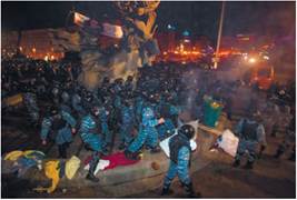 Ніч на 30 листопада відкрила нову сторінку історії України. Майдан оточили 2 тис. бійців загону особливого призначення МВС «Беркут». У цей час у наметах перебували до 400 беззбройних мирних протестувальників, переважно студенти. Міліція знищила намети і жорстоко побила всіх, хто потрапляв під руку. Декому вдалося втекти від «Беркута», а частина протестувальників заховалась у Михайлівському соборі. Зафіксовані на мобільні телефони жорстокі кадри облетіли всю планету. Дії міліції на майдані Незалежності засудили 10 обласних рад, включно з Донецькою та Луганською.