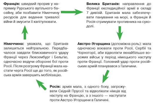 На розгром Франції, оборонна політика якої була побудована на неприступності французького кордону, відводилося не більше місяця. Потім німецькі війська планувалося перекинути на Схід і завдати поразки Росії. Проте німецькі дивізії наразилися на «незапланований» опір Бельгії (зокрема, фортець Любеж та Антверпен), а тим часом французи вступили в Ельзас-Лотарингію й рушили на Берлін. Ціною надзусиль французьку армію вдалося зупинити, і німецькі війська, захопивши Бельгію та Північну Францію, досягли р. Марни.