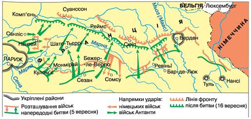На початку вересня 1914 р. у битві на р. Марні п’ять німецьких армій (900 тис. осіб) зазнали поразки від п’яти французьких армій та англійського експедиційного корпусу (разом понад 1 млн осіб). Німці відступили, і фронт стабілізувався по лінії м. Іпр (Північна Бельгія) — м. Верден (Франція). Усього в битві загинуло й було поранено майже 600 тис. осіб.