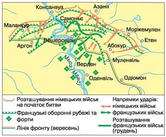 З початку 1916 р. німецька армія впродовж багатьох місяців намагалася прорвати фронт французьких військ поблизу м. Вердена. За час боїв французи таємно перекинули сюди майже 190 тис. солдатів і 25 тис. т військових вантажів. Командувач обороною міста маршал А. Ф. Петен отримав наказ за всяку ціну утримати Верден. Місто було врятоване ціною загибелі французької армії. Значних втрат зазнала й німецька армія. На полі бою загинуло понад 700 тис. французьких і німецьких солдатів. Під Верденом зазнав фіаско німецький стратегічний план кампанії 1916 р. — швидким ударом вивести Францію з війни.