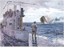 У 1914-1915 рр. активність німецьких підводних човнів була невисокою. Полювання на транспортні й пасажирські судна, торпедні атаки мали переважно психологічний вплив. У травні 1915 р. німецький підводний човен затопив пасажирський лайнер «Лузітанія», який ішов із Нью-Йорка до Ліверпуля. Загинуло майже 1200 осіб, серед яких було 128 громадян США.