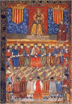 Король Фернандо на засіданні каталонських кортесів. Середньовічний малюнок