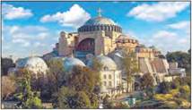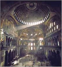 Вершиною візантійського церковного зодчества є константинопольський собор Святої Софії (Айя-Софія), будівництво якого закінчилось у 535 р. Він був головним, а тому найбільшим і найкраще оздобленим храмом цілої імперії. Після захоплення Константинополя турками-османами собор перетворили на мечеть Айя-Софію, а вже у 1935 р. — на музей, відкритий для всіх охочих. У храмі Святої Софії найбільше вражає купол діаметром 32 м. Під ним по колу розміщено сорок вікон, через які ллється світло. Завдяки цьому здається, ніби сам купол висить у повітрі.