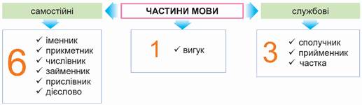 1. Які є самостійні та службові частини мови? Яка частина мови не належить до жодної із цих груп?