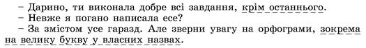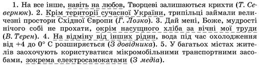 1. Там замість житечка (у,в) теплеє літечко терен зацвів (Г. Чупринка). 2. Розум (на)відміну від дурості, стає позаду, щоб бачити (у,в)сіх (Кармен Сільва). 3. У хліві крім ластів’ячого гнізда під кроквою (ні) чого не було (Г. Тютюнник). 4. На дні моря крім в(е,и)ликих каменів і піску нічого не було видно (М. Коцюбинський). 5. Пахне грибами (і,й) медом, вільніс(т,тт)ю пахне тією, що опріч назви осінь (не)має імені їй (М. Рильський). 6. А може я справді на світі найкраща та всі окрім тебе не знають про це? (Г. Чубач).