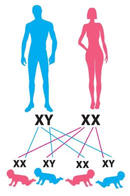 Стать майбутньої дитини визначається в момент запліднення. Якщо з яйцеклітиною злився сперматозоїд, який має Х-хромосому, то народиться дівчинка. А якщо сперматозоїд мав Y-хромосому, то народиться хлопчик (мал. 97.1).