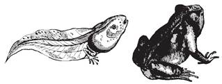 Мал. 85.2. Довгий хвіст пуголовка під час метаморфозу коротшає за рахунок загибелі клітин (апоптоз) і перетворюється на короткий хвіст дорослої жаби.
