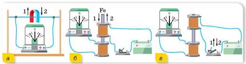 Мал. 69. Досліди з виявлення явища електромагнітної індукції