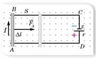який у провіднику проходить перпендикулярно до ліній індукції магнітного поля. Водночас на провідник довжиною Δl діє сила Ампера FА = ВIΔl, у результаті чого провідник переміщується прискорено, і за час Δt пройде шлях s. Під час проходження струму I в замкненому колі ABCD протягом часу Δt виділяється ленц-джоулеве тепло Q = I2(R + r)Δt та виконується механічна робота з переміщення провідника на шляху s: А = FAs = BIΔls = BIΔS = IΔΦ . За законом збереження енергії, ці витрати повинні дорівнювати повній роботі джерела струму А' = εIΔt, тобто εIΔt = I2(R + r)Δt + IΔФ.