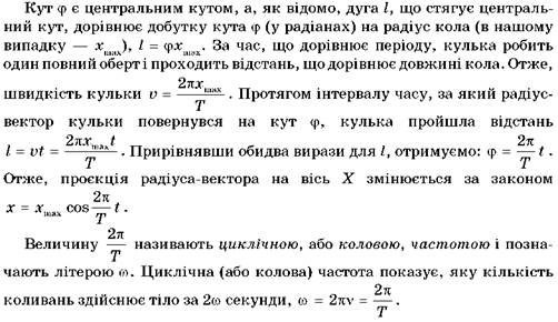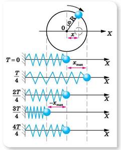 Нехай по колу рівномірно рухається кулька (мал. 84). Розташуємо горизонтальний пружинний маятник паралельно осі X так, щоб положення рівноваги кульки маятника розмістилося на одній вертикалі з центром кола. Виведемо маятник з положення рівноваги, розтягнувши пружину на величину хmax = R. Легко помітити, що під час руху кульки по колу проекція її радіуса-вектора здійснює коливання вздовж діаметра, тобто вздовж осі X, аналогічні коливанням кульки маятника. Центр кола відіграє роль положення рівноваги, радіус кола R — роль амплітуди коливань хmах, період обертання кульки — відповідає періоду коливань Т, проекція радіуса-вектора в довільний момент часу відповідає зміщенню х = xmax cos φ, де φ — кут повороту радіуса-вектора.
