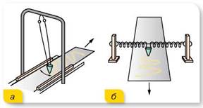 Графіки гармонічних коливань. Графіком гармонічних коливань є крива, яку в математиці називають синусоїдою або косинусоїдою. Графік гармонічного коливання можна дістати безпосередньо з досліду, якщо за коливне тіло взяти пісочницю, з якої висипається пісок. Пісочницю підвішують на довгій нитці (мал. 85, а) або закріплюють на пружинах (мал. 85, б) і змушують здійснювати коливання. Якщо під пісочницею протягувати папір, то на ньому залишається слід, що нагадує синусоїду.