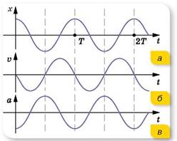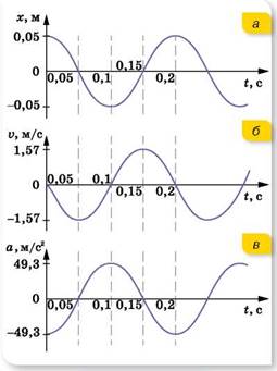 Мал. 87. Графіки залежностей: а — х(t); б — v(t); в — a(t)