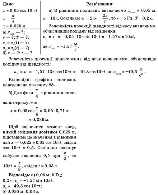 Задача. Тіло здійснює гармонічні коливання за законом х = 0,05 cos 10 пt, де всі величини задано в СІ.