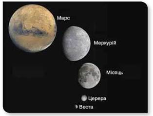 Мал. 205. Астероїди Церера та Веста в порівнянні з іншими об’єктами Сонячної системи