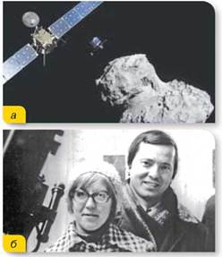 Мал. 206. Місія «Розетта» до комети Чурюмова — Герасименко (а); Світлана Іванівна Герасименко та Кпим Іванович Чурюмов (б)