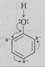 2) зростання електронної густини в орто- і пара-положеннях (положення 2, 4 і 6) бензенового ядра, де на атомах Карбону виникають часткові негативні заряди, а на відповідних атомах Гідрогену — позитивні, що робить їх рухливішими і вони легко вступають у реакції заміщення. Фенол значно активніший за бензен.