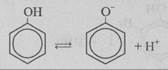 1) зростання полярності зв’язку О-Н значно більше, ніж у молекулах одноатомних ненасичених спиртів. Електронна хмара ще більше відтягується від гідроксильного атома Гідрогену, роблячи його ще рухливішим, а отже кислотні властивості фенолу виражені значно сильніше, ніж у спиртів1 (але слабше, ніж у карбонатної). У водному розчині його молекула дисоціює, утворюючи фенолят-іон (лакмус змінює свій колір на червоний, а метилоранж — на рожевий):