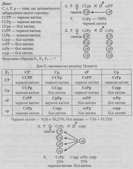 401. У запашного горошку пурпурне забарвлення квіток зумовлене поєднанням дії двох домініантних комплементарних (що доповнюють один одного) генів — С і Р. Якщо обидва вони (або один з них) відсутні, пігмент не утворюється і квітки залишаються білими.