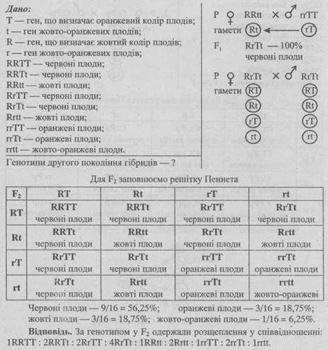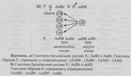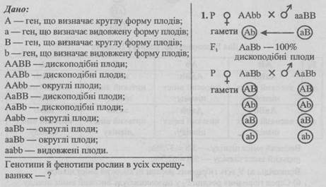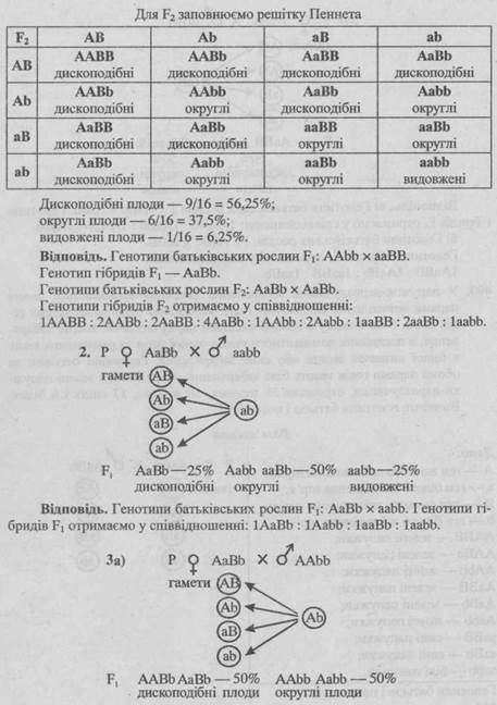 - 1. Схрестивши дві рослини з округлими плодами, отримали рослини з дископодібними плодами. Схрестивши дископодібні гарбузи між собою, отримали рослини, які дали всі три форми плодів: з дископодібними плодами — дев’ять, з округлими — шість, з видовженими — одна. Визначте генотипи батьківських рослин та гібридів першого і другого поколінь.