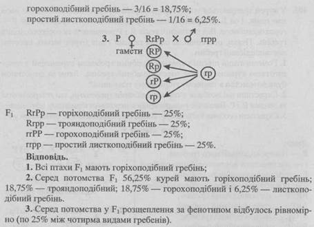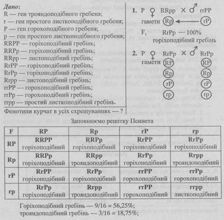 - 1. Гомозиготний півень з трояндоподібним гребенем схрещений з гомозиготною куркою, що має горохоподібний гребінь. Яким за фенотипом буде потомство в першому гібридному поколінні?