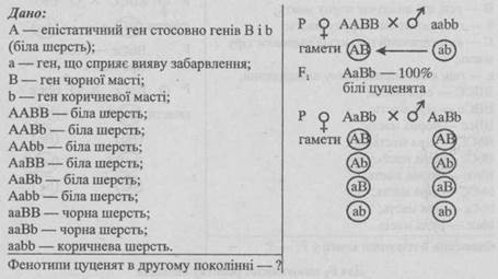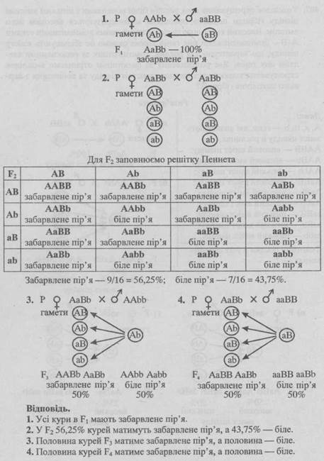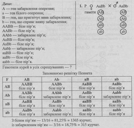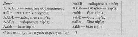 - 1. Білих курей з генотипом ААbb схрестили з іншою породою, що має генотип ааВВ. Яке забарвлення буде у гібридів F1?