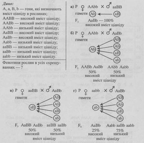 Відповідь. а) У всіх гібридних рослин F1 високий вміст ціаніду.