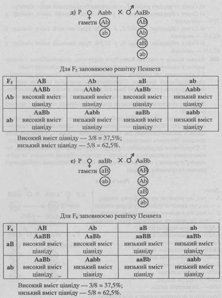 е) Серед гібридних рослин F6 у 37,5% буде високий вміст ціаніду, у 62,5% — низький.