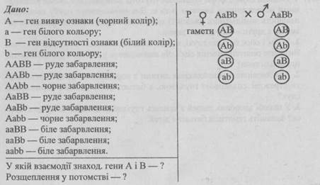 410. Ген А визначає появу ознаки (чорний колір), В — відсутність ознаки (білий колір), а поєднання генів А і В дає руде забарвлення. Схрестили дві дигетерозиготні тварини, що мають руде забарвлення. Визначте, у якій взаємодії знаходяться гени А і В та яке розщеплення спостерігатиметься у потомстві?