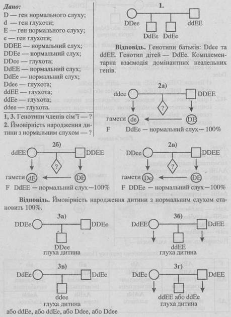 - 1. У сім’ї обоє батьків глухі, а двоє їхніх дітей мають нормальний слух. Визначте генотипи членів сім’ї. Як взаємодіють у цій сім’ї два домінантні неалельні гени?